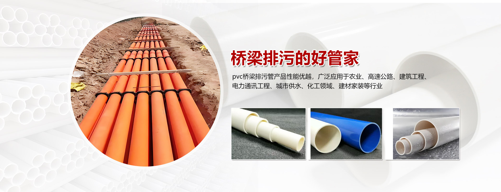 主營產品包含橋梁排水排污管,電子通信PVC管材管道,電工套管,農業排污管等;